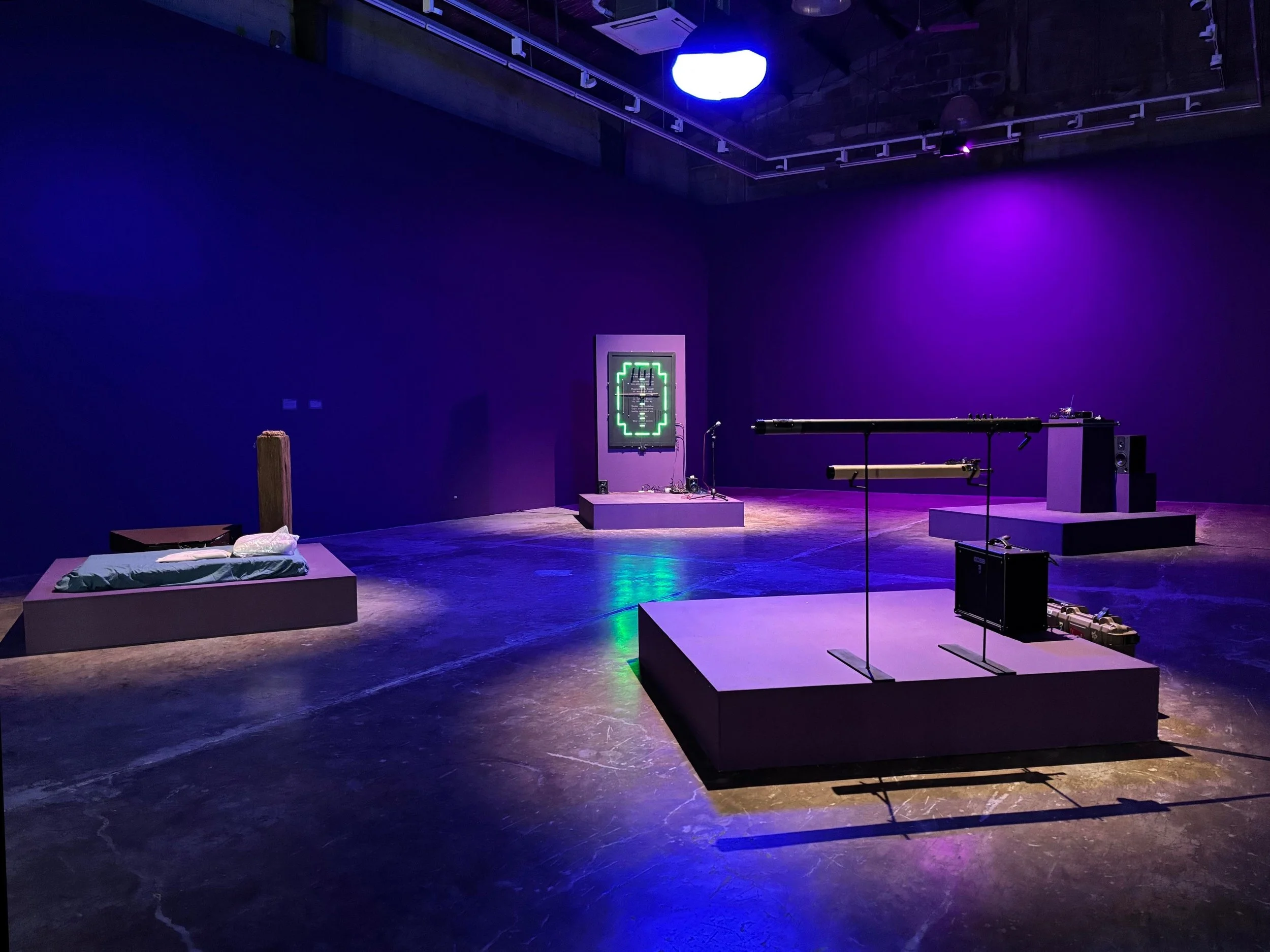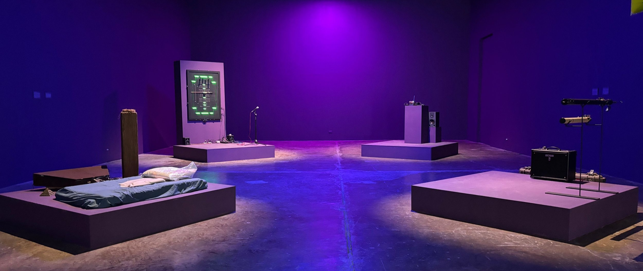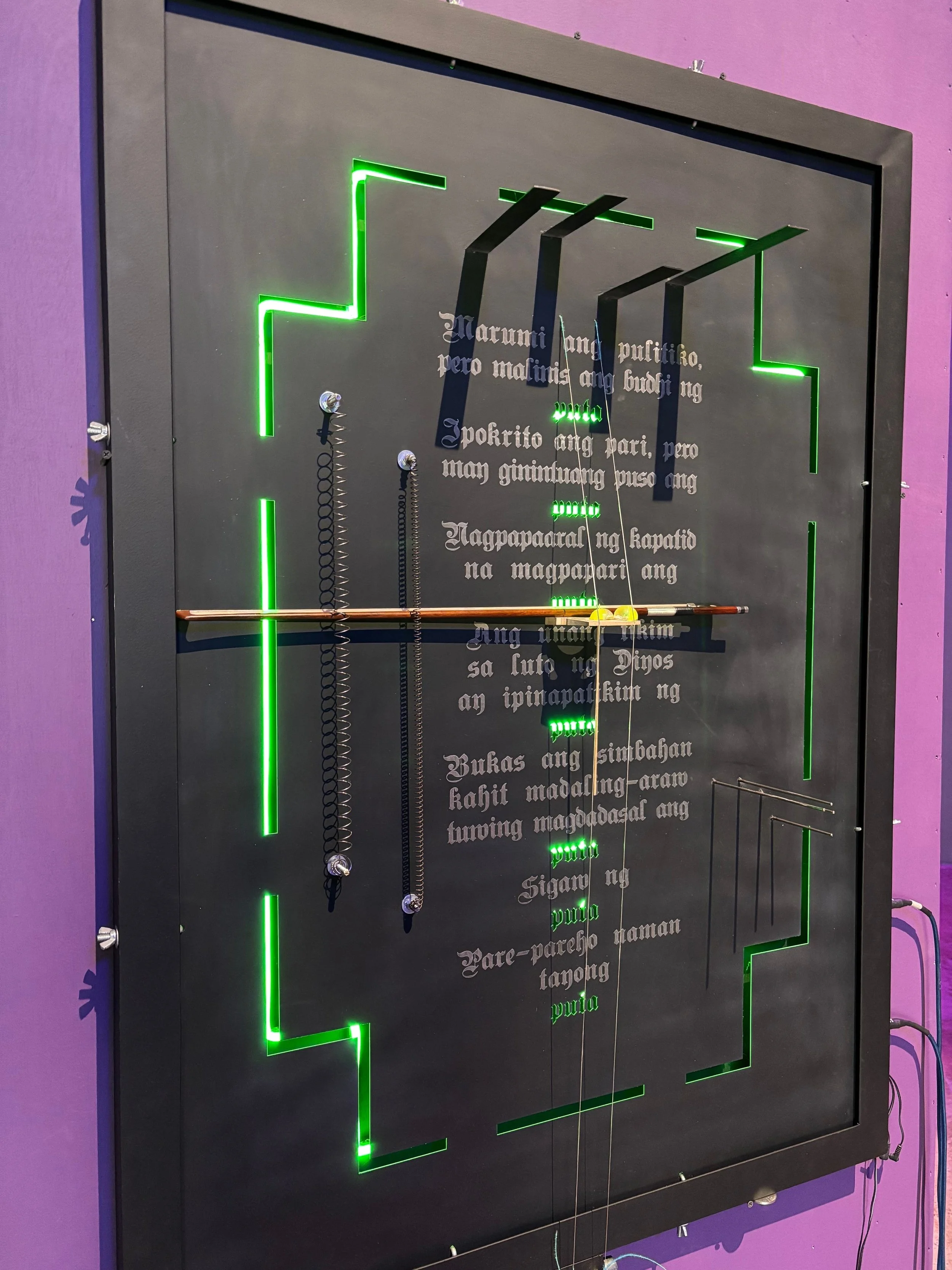 Solinaw Alingawngaw is conceived as a modern ritual object in the form of a cross. Its steel plate and custom knobs evoke the textures of horror-movie sound design, each string and mic amplifying eerie timbres through vibrations which is picked up with a contact mic. When playing the instrument, the performer must read Pete Lacaba’s poem Lahat ng Hindi Ko Kailangang Malaman, Natutunan Ko sa Pelikulang For Adults Only (1983) from the cross’s center, transforming text into an incantation. A steady LED light bathes the steel surface in an otherworldly glow, underscoring the work’s fusion of past and present. Through every bow stroke and pluck, Solinaw Alingawngaw illustrates how small gestures “reverb” outward like a butterfly effect, reflecting on how modern poems serve as our spells and prayers today.
